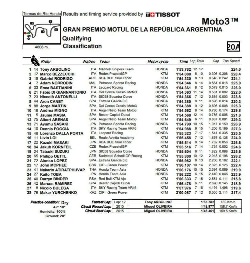 Já o terceiro lugar da grelha de partida para o GP da Argentina será ocupado por Gabriel Rodrigo (RBA BOE Skull Rider), que chegou a liderar a tabela de tempos mas terminou a 0,548s da pole.
