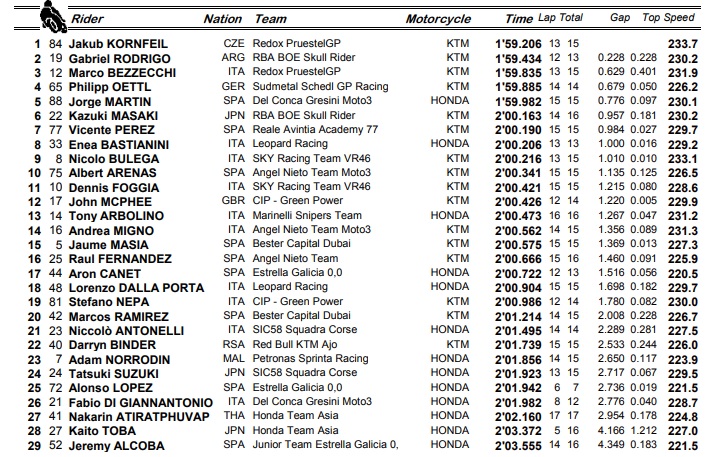 Marco Bezzecchi foi o terceiro, mas já a mais de meio segundo, enquanto Philipp Öttl e o líder do campeonato, Jorge Martín, completaram o top cinco da sessão. Nota ainda para o facto da KTM ter colocado oito motos entre os 10 primeiros contra apenas duas da rival Honda.