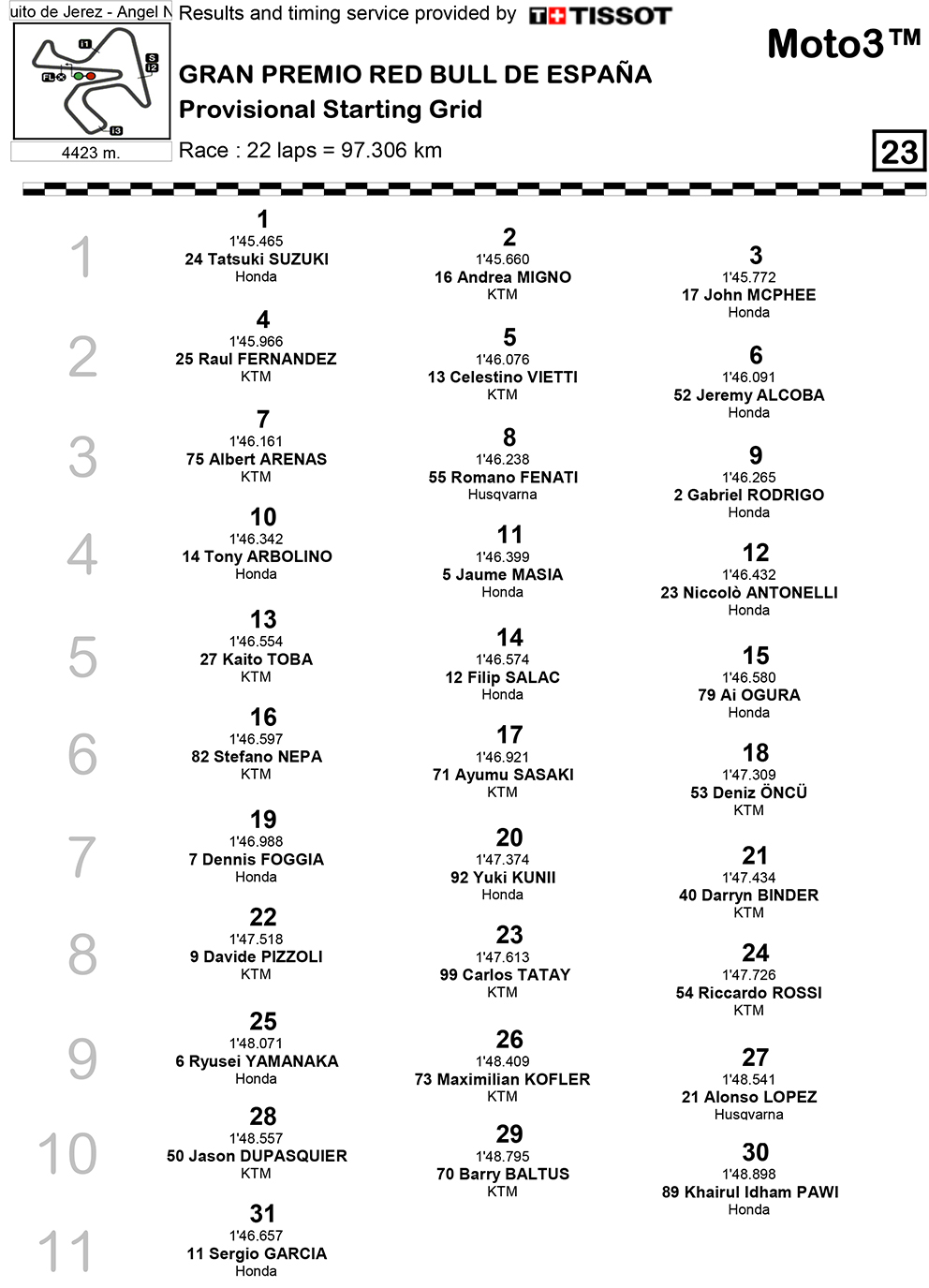 A oposição vinha de Fenati, Antonelli e Arbolino, recém-chegados da Q1 e portanto com muito ritmo, e dum sortido de outros onde apareciam Masia, Arenas, Oguma, Alcoba e Sasaki.