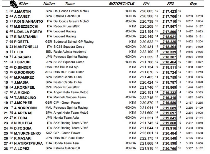A segunda sessão de treinos livres entre os homens da categoria mais baixa do Mundial terminou da mesma forma que a primeira. Isto é com Jorge Martín em primeiro.