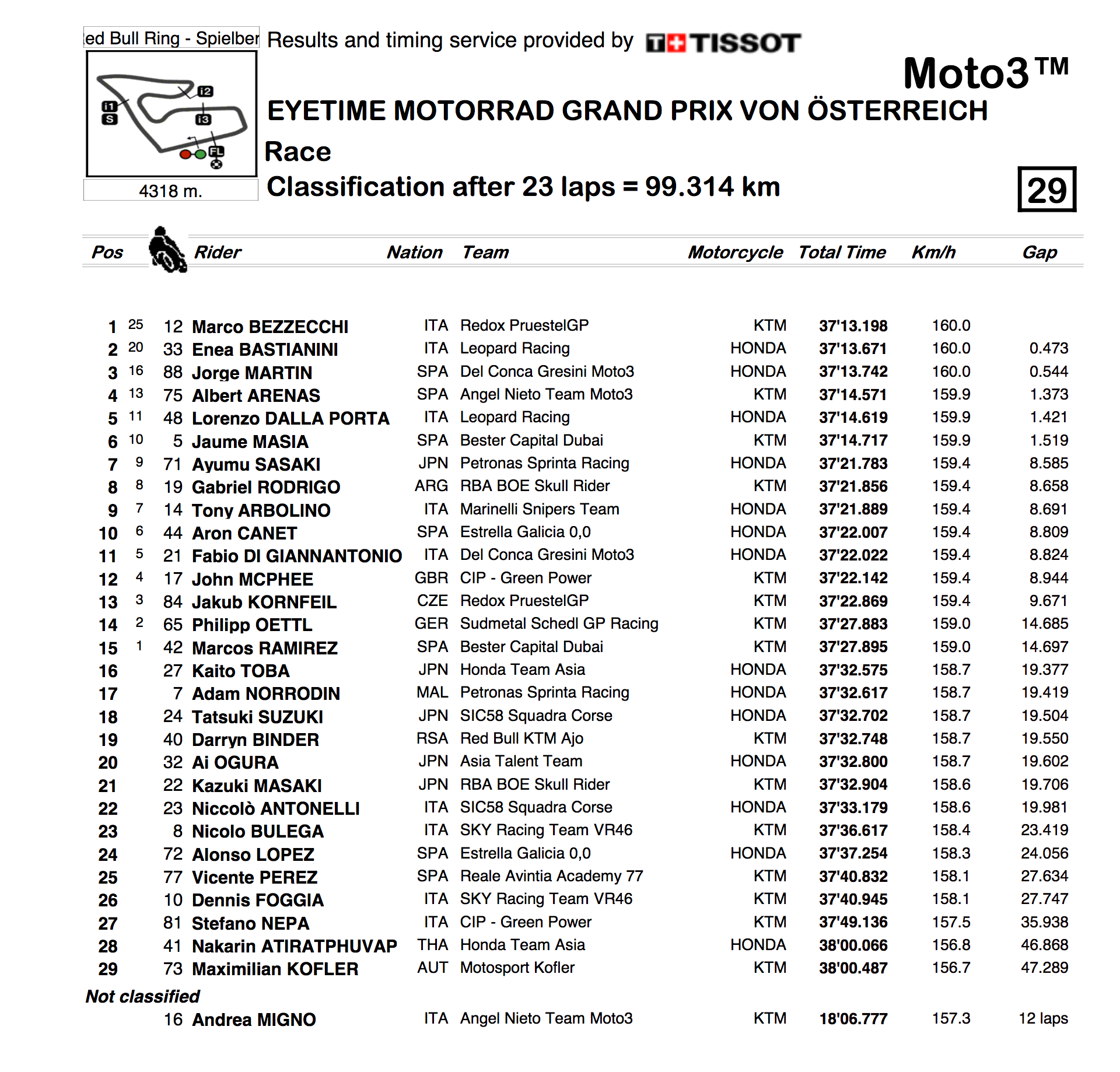 Nas contas do campeonato, Bezzecchi aumentou para 12 pontos a vantagem para Martin. Fabio di Giannantonio foi 11º, mas mantém o terceiro posto, tendo Aron Canet – 10º na Áustria – a três pontos e Bastianini fecha o top 5, a apenas um ponto de Canet.
