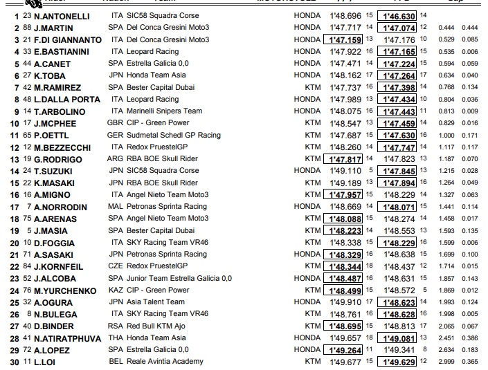 No terceiro lugar, mas já a mais de meio segundo, ficou Enea Bastianini, que foi secundado por Fabio di Giannantonio, piloto que foi o mais veloz na primeira sessão do dia e agora foi dos poucos, entre os homens da frente, que não melhorou o seu registo. Arón Canet concluiu o top cinco da sessão. Já a melhor KTM ficou em sétimo, registo da autoria de Marcos Ramírez.