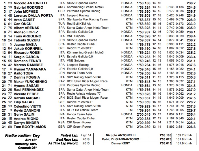 Lorenzo Dalla Porta e o líder do campeonato Arón Canet completaram o top cinco da sessão. Nota ainda para o excelente sexto lugar de Cän Oncü que pela primeira vez deu sinais de existência nesta temporada de 2019, onde até ao momento tem desiludido e muito ao não ter somado qualquer ponto. Veremos se o jovem talento turco consegue prolongar este momento durante as restantes saídas para a pista.