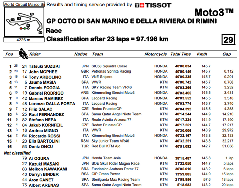 À entrada da última volta, a queda de Migno, que deita abaixo Ogura, deixa McPhee de repente em 3º e a seguir o Escocês passa Arbolino para 2º, e Suzuki consegue a sua primeira vitória em Moto3 no circuito que leva o nome da sua equipa, com Arbolino 3º…