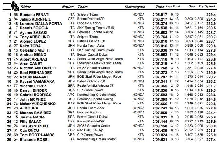 Fenati bateu por 0.300s Jakub Kornfeil, que é o mais experiente piloto em pista. Numa sessão disputada com luz solar, Lorenzo Dalla Porta, Dennis Foggia e Ayumu Sasaki completaram o top cinco da folha de tempos.