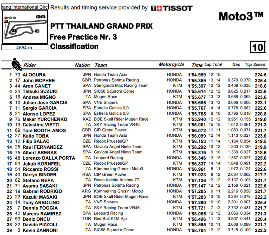 Agora, a 7 minutos do final, era McPhee no topo, e Darryn Binder a cair no traiçoeiro piso Tailandês, com Lopez a desafiar o melhor tempo de Ogura para se tornar o mais alto dos qualificados automaticamente, em terceiro na sessão mas a cair logo a seguir.