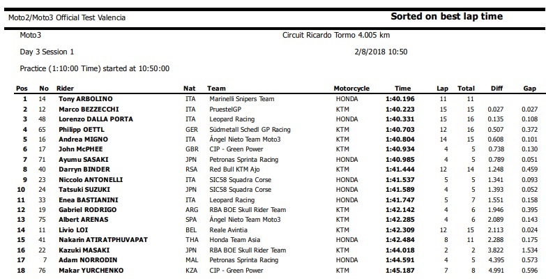 Numa sessão onde rodaram 18 pilotos o mais veloz foi Tony Arbolino. Aos comandos da KTM da Marinelli Snipers Team, o piloto italiano rodou em 1m40.196s, marca que é até ao momento a mais rápida dos testes para os pilotos de Moto3. Arbolino alcançou este registo na 11ª e última passagem que fez pela linha de meta e bateu por apenas 27 milésimos Marco Bezzecchi, que continua em bom plano com a KTM da PrüstelGP.