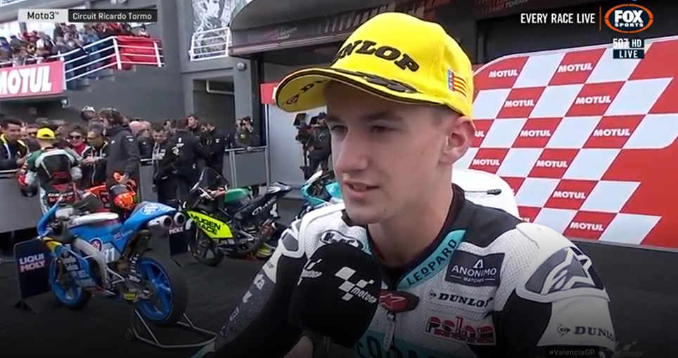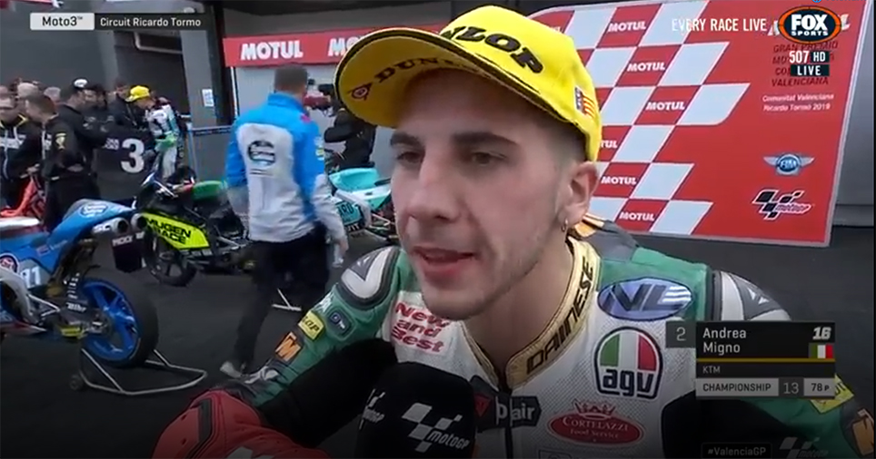 “Estou muito contente com o fim-de-semana, saí da pole e fiz uma boa corrida estou contente pela equipa, tenho que agradecer à equipa e ao Rancho VR46, que me ajudou muito a crescer como piloto e… nada!”