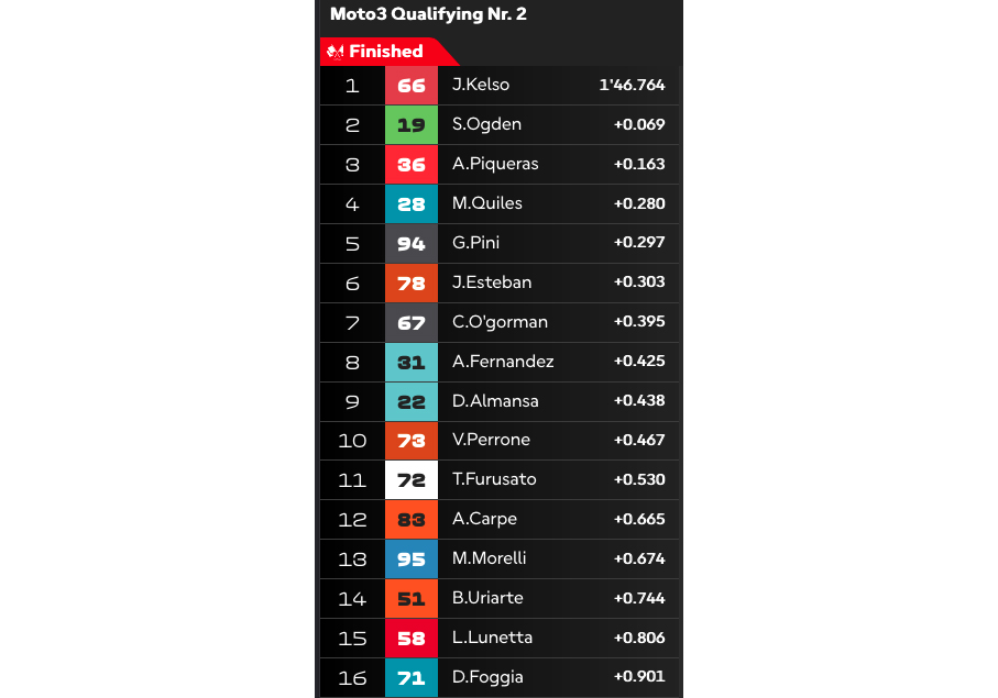 Nos minutos finais, Quiles, Ogden, Piqueras e Kelso estavam separados por nada, mas com uma queda de Quiles na curva 13, o australiano acabaria por fazer a pole em 1:46.764, já com a bandeira mostrada…