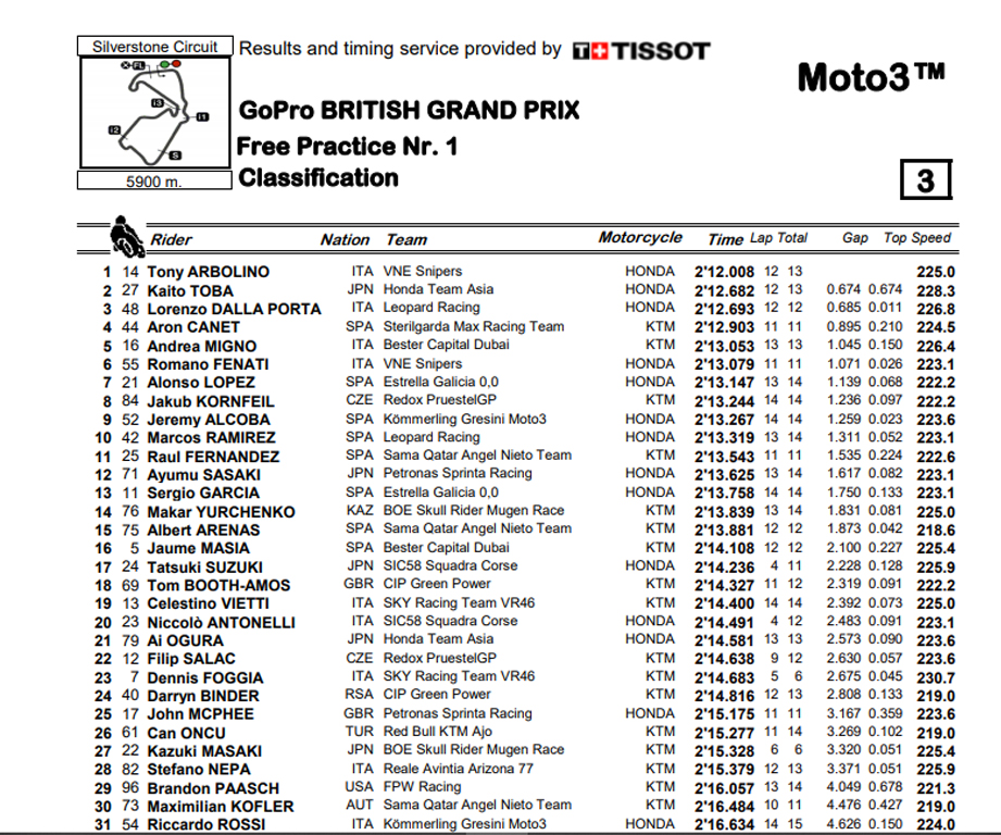 O primeiro treino livre das Moto3 inaugurou a ação em Silverstone de forma dramática quando aos 16 minutos da sessão Masaki abalroou Foggia na travagem ao fim da reta da meta… ambos ficaram ilesos, mas deixando muita contaminação na pista…