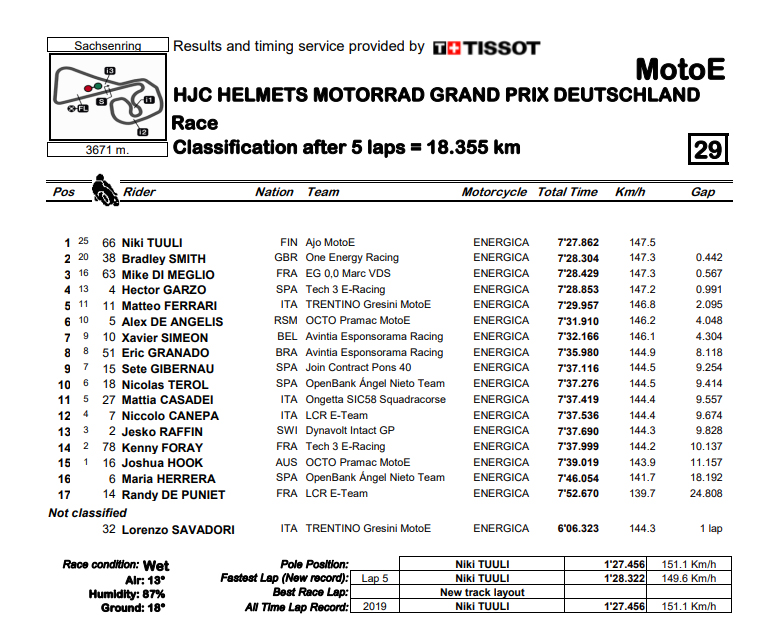 O Finlandês Nikki Tuuli ganhou o que ficará para a história como a primeira corrida de sempre de MotoE, que viu a sua distância encurtada para apenas 5 voltas por uma violenta queda de Lorenzo Savadori, com os espetadores a habituarem-se à nova categoria quase silenciosa no traçado Alemão pela primeira vez.