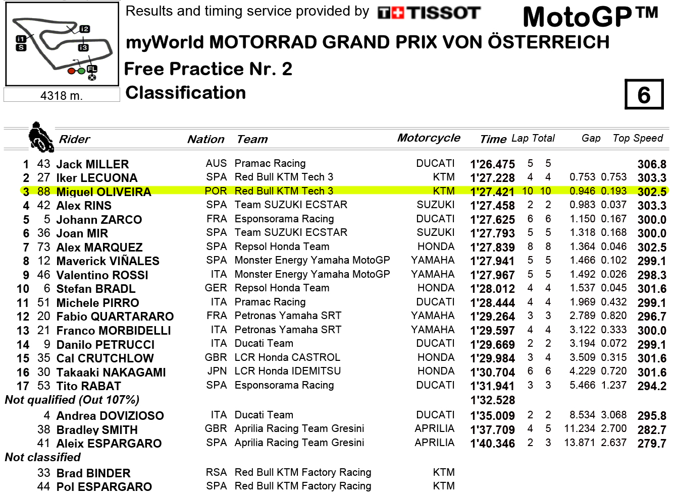 Eventualmente, Zarco fez um tempo que o colocou à frente, e mesmo no final da sessão, com a pista quase seca, Lecuona e Miller também bateram o tempo de Oliveira, numa sessão com pouco significado.