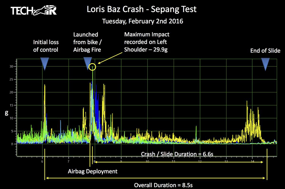 Outra aplicação de telemetria que exibe a tecnologia moderna são os incríveis gráficos das quedas registados pelos fatos airbag da Alpine Stars ou Dainese, com as próprias marcas a mostrarem por vezes o que acontece enquanto o piloto voa pelos ares, o airbag entra em ação e depois a fase de aterragem, tudo a ocorrer em centésimas de segundo mas claramente ilustrado em detalhe na telemetria.