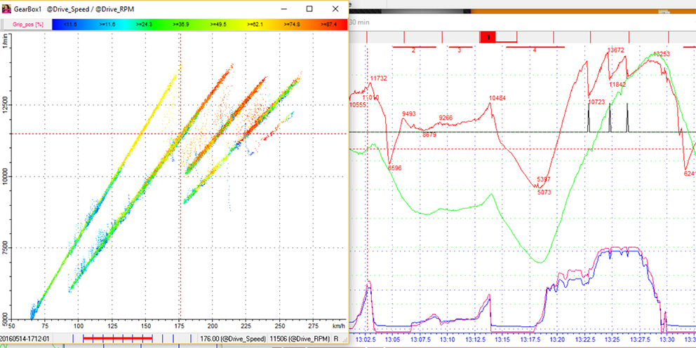 Outro dado importante são as leituras dos controlos de tração, mostrando a que grau de inclinação, velocidade e abertura do acelerador o pneu começa a derrapar o que permite, portanto, afinar tudo ao mínimo pormenor.