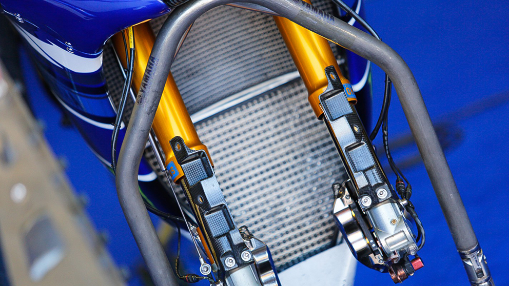 Começando pelo dianteira, os garfos, basicamente um tubo que desliza dentro de outro tubo maior, com um curso de cerca de 130 mm numa MotoGP, são universalmente do tipo cartucho, ou seja são um componente completamente selado, que pode ser removido da moto sem que isso tenha implicações na sua desmontagem interna, que pode ser feita posteriormente em separado.