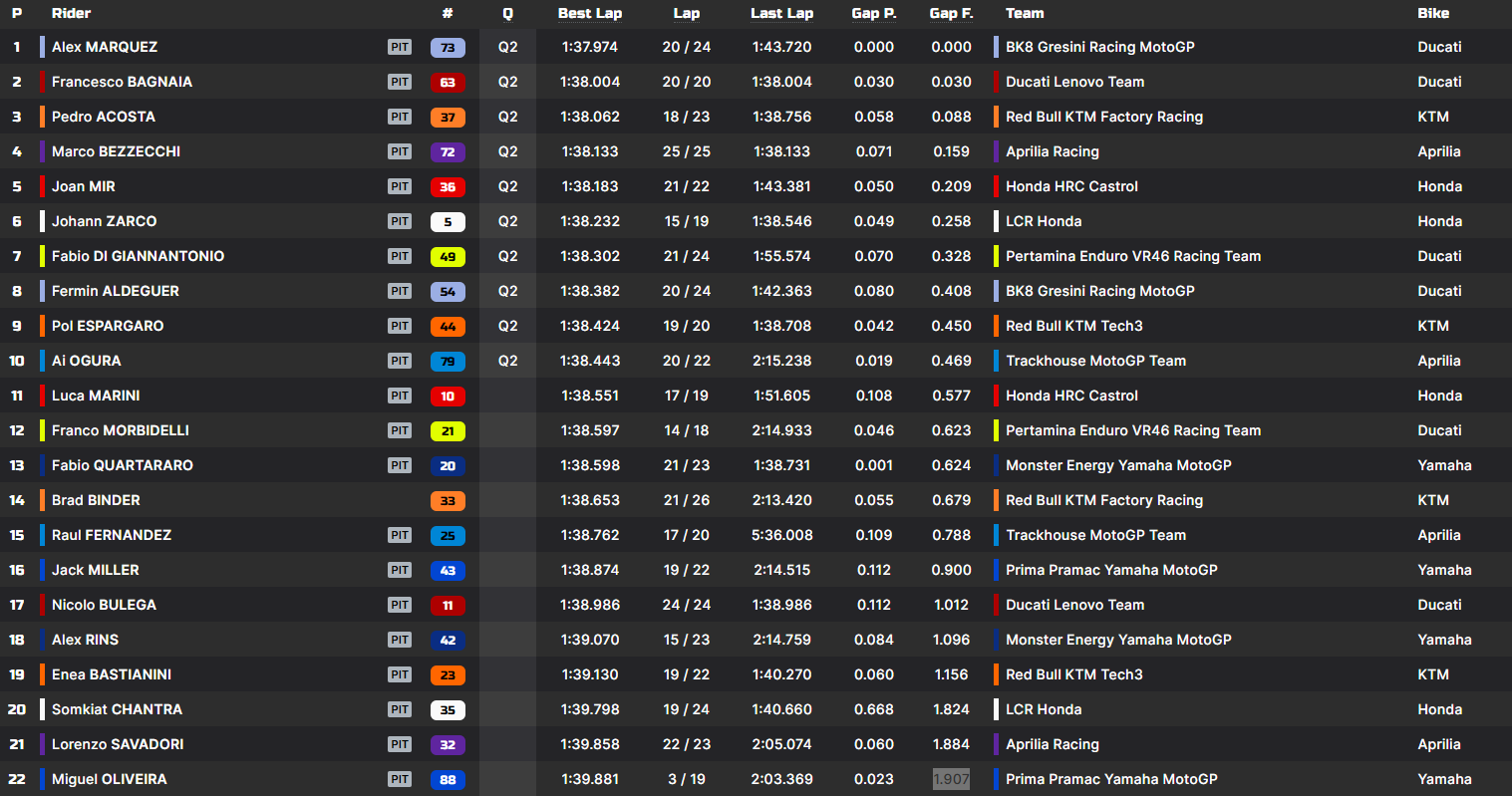 Na terceira posição ficou Pedro Acosta (+0.088) com os três primeiros separados por menos de 0.100 milésimos de segundo, prometendo uma corrida Sprint e um GP de Portugal muito renhido. A fechar o Top 5 ficaram ainda Marco Bezzecchi (+0.159) e Joan Mir (+0.209) na quarta e quinta posição, respetivamente.