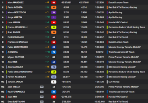 O campeão em título Jorge Martin disparou de 16º para uma impressionante quarta posição na outra Aprilia de fábrica, com Luca Marini, da Honda, a tentar também uma ultrapassagem tardia sobre Morbidelli. O piloto da VR46 manteve-se na frente após encurtar a curva e recebeu ordem para perder uma posição. Brad Binder e o substituto da Tech3, Pol Espargaró, somavam três KTMs entre os oito primeiros.