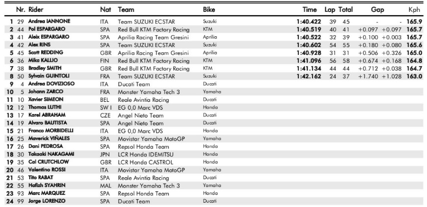 Durante a tarde, já com o asfalto seco, só rodaram os pilotos da KTM e Suzuki, homens de ensaios incluídos, bem como os pilotos da Aprilia Gresini. Curiosamente as equipas, que ao contrário dos restantes conjuntos oficiais, não têm limitação quanto aos dias de ensaios que podem realizar.