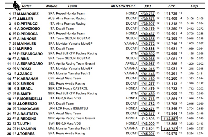 De referir que dos 25 pilotos que estiveram em pista durante o dia, apenas Scott Redding e Hafizh Syahrin melhoraram os tempos pessoais de uma sessão para a outra.