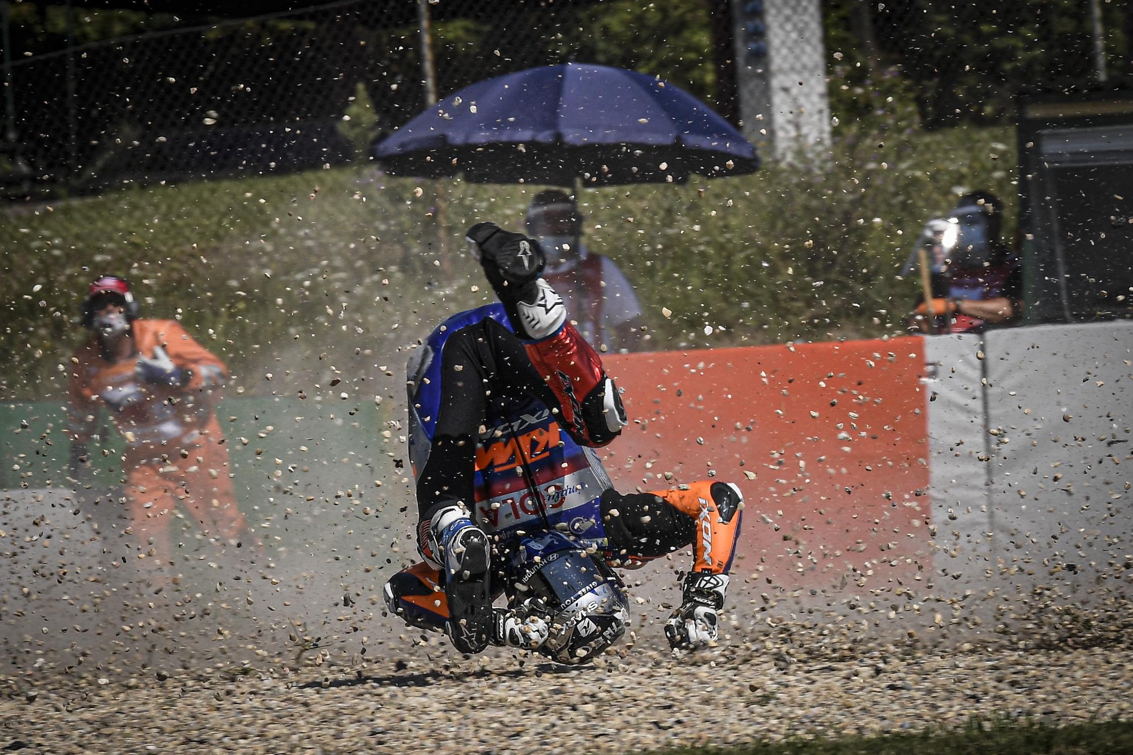 Após o impressionante terceiro lugar de sexta-feira, Miguel Oliveira também teve um bom começo no sábado, mas perdeu a frente da sua KTM RC16, o que resultou numa queda aparatosa.