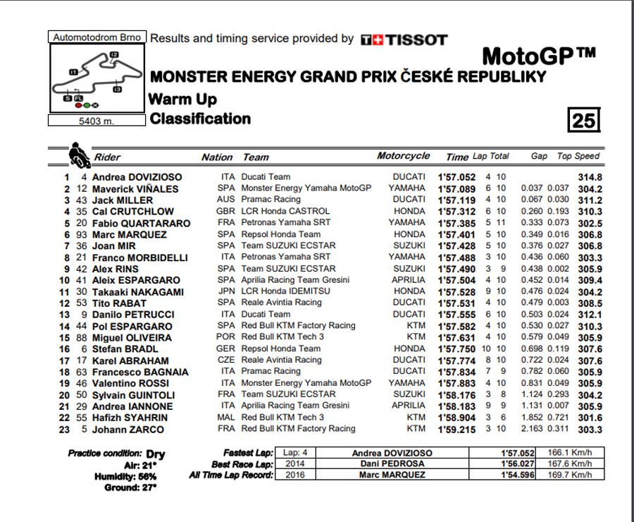 Andrea Dovizioso, obviamente a testar táticas para a corrida com uma escolha de dois pneus médios, quando a maioria estava com uma slick traseiro macio, instalou-se à frente da sessão 5 minutos depois… mas com tudo muito próximo, pois Viñales rodava apenas 0,067 mais lento, seguido de Miller de novo.