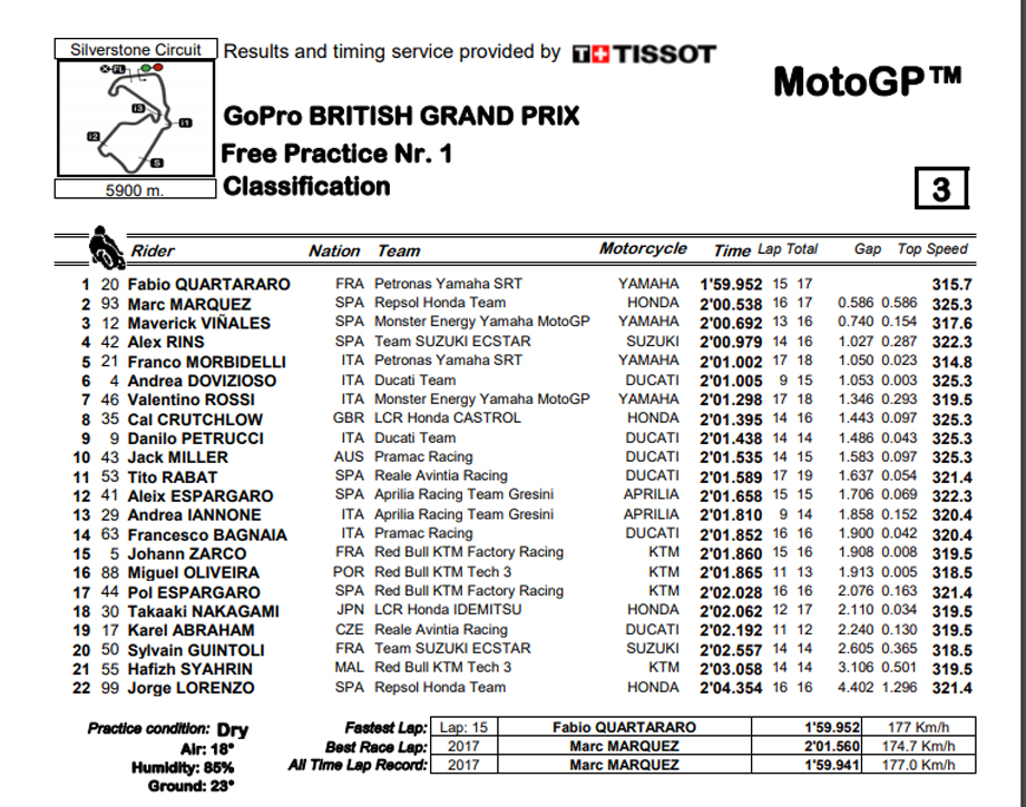 Rossi, também em pneus médios, chegou a 5º mas a 0,988 do tempo de Márquez…