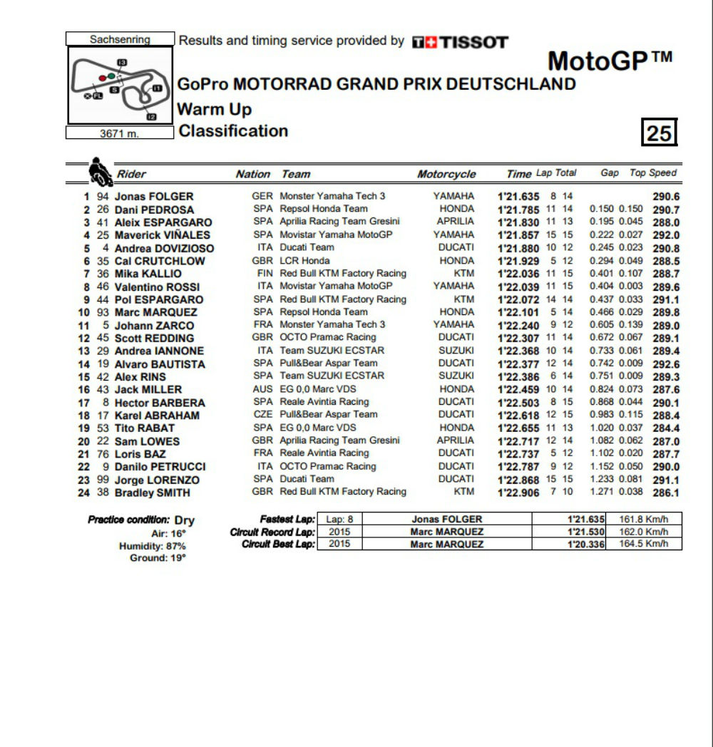 Jonas Folger (Monster Yamaha Tech3) foi o piloto mais rápido no Warm-Up do GP da Alemanha, que se realiza este domingo no circuito de Sachsenring,