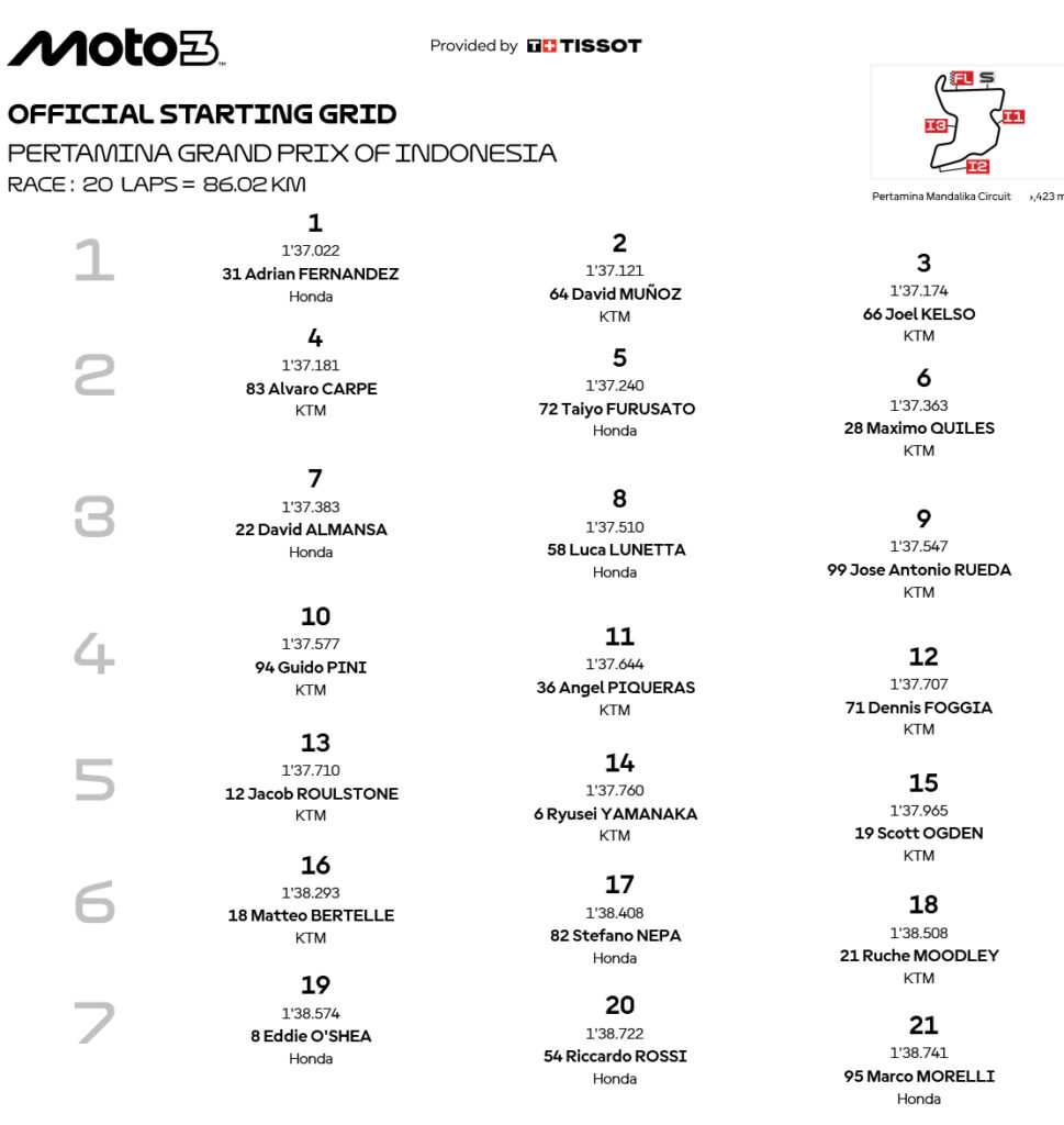 Uma sequência de setores vermelhos no final da corrida criou uma grelha interessante em Mandalika, para o que poderá ser a decisão do título de Moto3 no domingo.