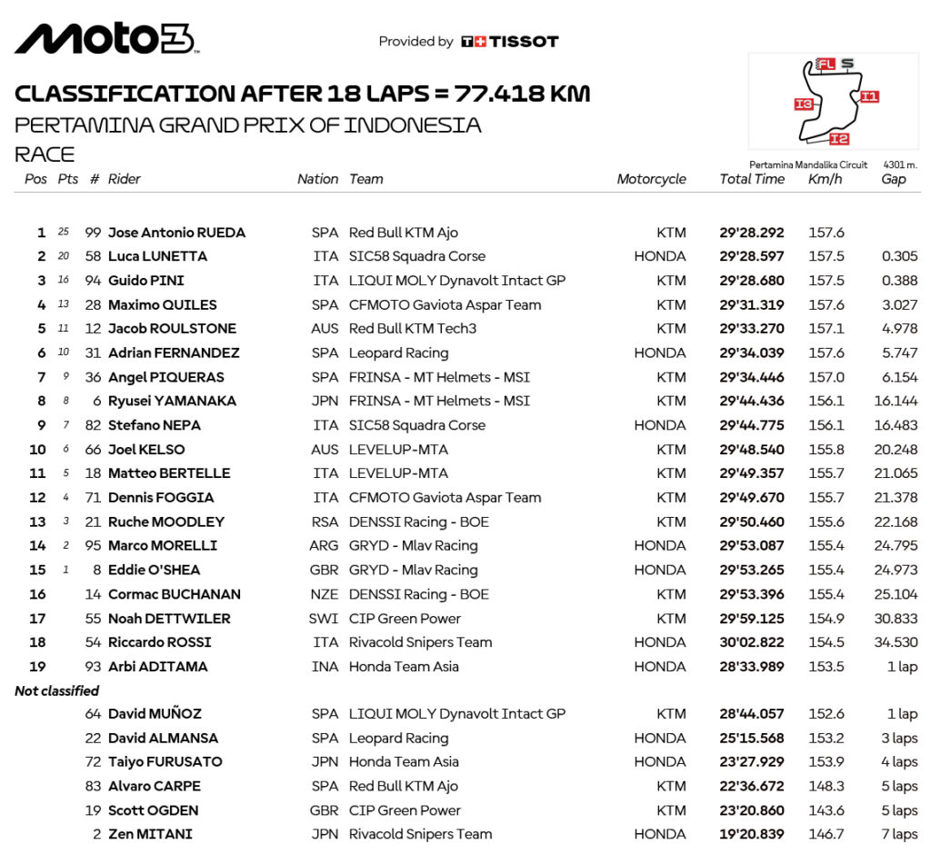 Com o resultado, Rueda não só se tornou oficialmente Campeão do Mundo de Moto3 de 2025, após um duplo castigo de Volta Longa aplicado a Fernández, , como foi sagrado vencedor na Indonésia.