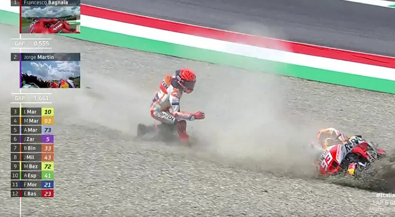 Depois da queda de Marc Márquez que viu fugir a frente da moto da Repsol Honda e terminou a corrida na gravilha, foi a vez do seu irmão mais novo ver fugir bom resultado. Quando tudo apontava para um possível pódio, o mais novo dos Márquez também caiu. O piloto não conseguiu controlar a moto na saída da curva e caiu… Fim de semana negro para a família Márquez.