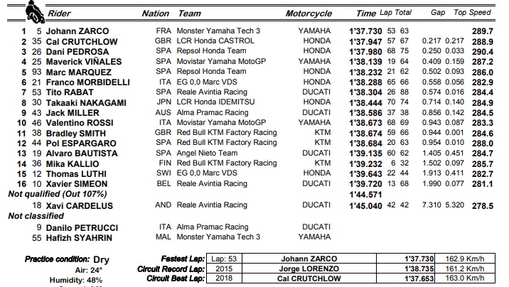 Zarco rodou em 1m37.730s e ficou a menos de 0.1s do tempo que deu a pole a Cal Crutchlow no passado sábado. Crutchlow que foi precisamente o segundo a 0.217s do gaulês. Seguiu-se Dani Pedrosa, o último piloto a entrar no segundo 37. O piloto da Honda rodou magoado na perna direita devido à aparatosa queda sofrida no dia anterior.