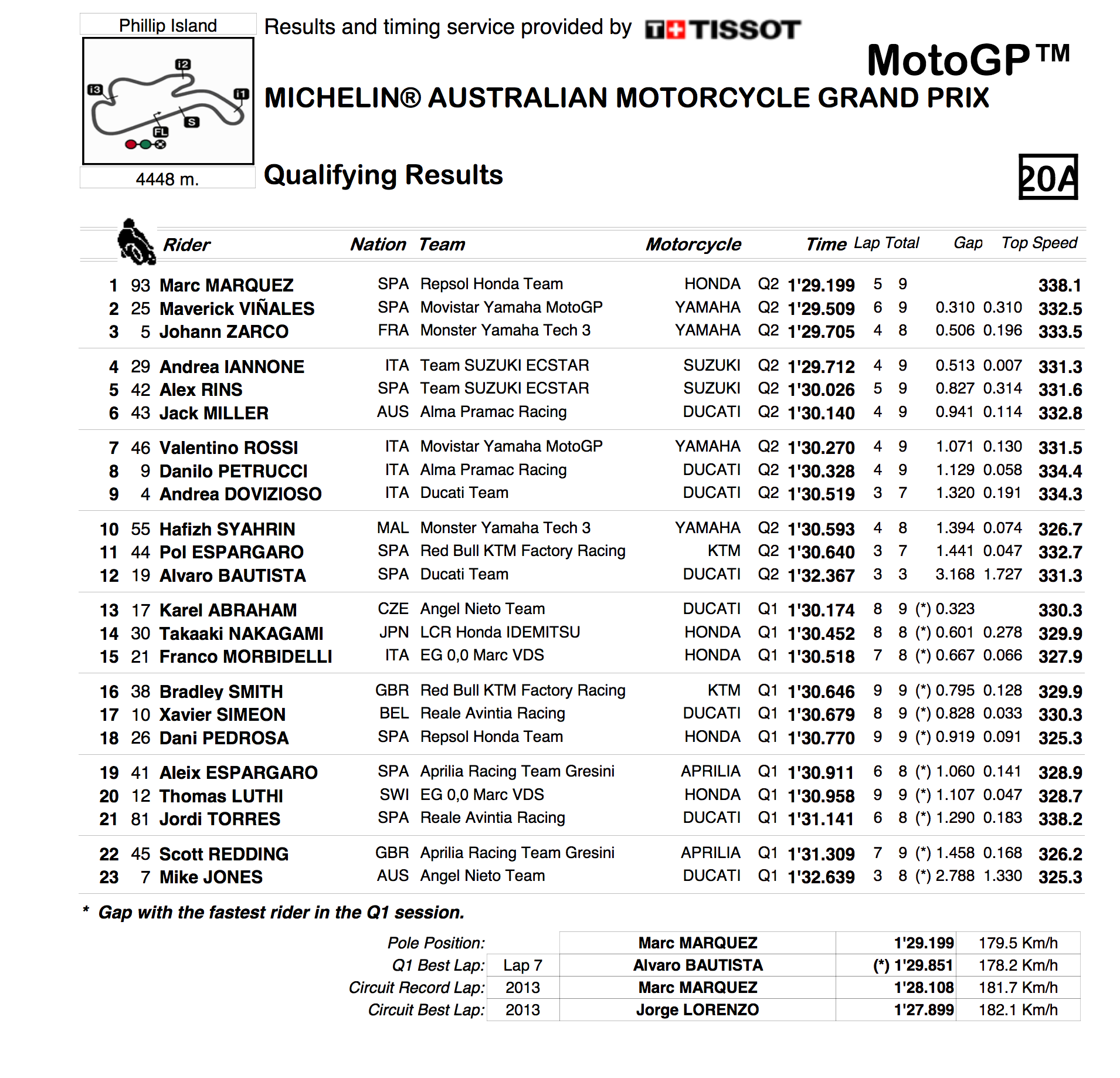 Marc Márquez conquistou mais uma pole position na Austrália. O espanhol tem saído de priemiro em Phillip Island desde 2014 e não deu hipóteses à concorrência, terminando com uma vantagem de 0.310s para Maverick Viñales, que foi o segundo mais rápido. Johann Zarco fecha a primeira linha.