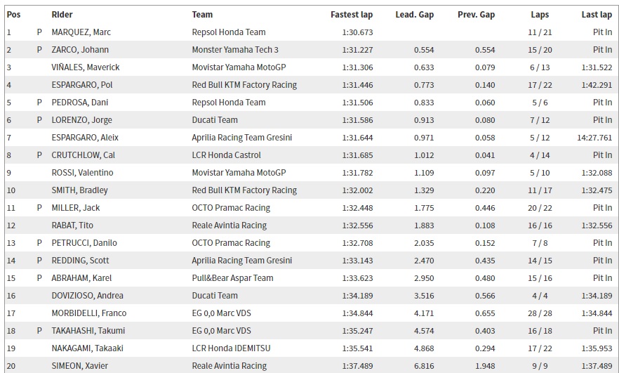 No segundo posto está Johann Zarco, que é o melhor piloto aos comandos de uma Yamaha. Zarco está a 0.554s de Márquez. Seguem-se Maverick Viñales, Pol Espargaró e Dani Pedrosa que fecha o top cinco. Entre os construtores presentes em MotoGP de referir que apenas a Suzuki ainda saiu para a pista com os seus dois pilotos: Andrea Iannone e Álex Rins.