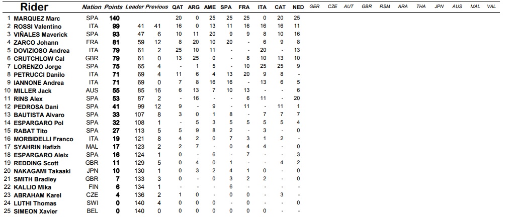 Ao final de oito Grandes Prémios temos Marc Márquez numa posição privilegiada e naturalmente como grande favorito à conquista do título, que caso venha a acontecer será a revalidação do ceptro conquistado em 2017.