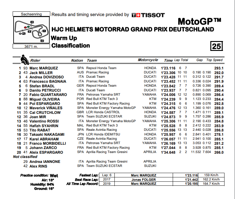 A segundos do final, Márquez fez um 1:23.116, que o colocou à frente, e Oliveira aparecia em 8º, lugar onde acabaria como primeira KTM, com Espargaró 0, 076s atrás de si, mostrando evolução finalmente nas KTM e muita confiança nas condições ainda traiçoeiras do Sachsenring.