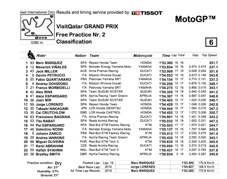 Os treinos valem o que valem, mas quando foi mesmo a contar, Marquez mostrou porque domina a classe há 3 anos, marcando o mais rápido tempo de sempre em redor de Losail para liderar a FP2 de MotoGP conclusivamente. O seu tempo de 1:53.380 ficou 3/10 abaixo do anterior recorde, e deixou o anterior tempo de Rossi a quase 2 segundos…