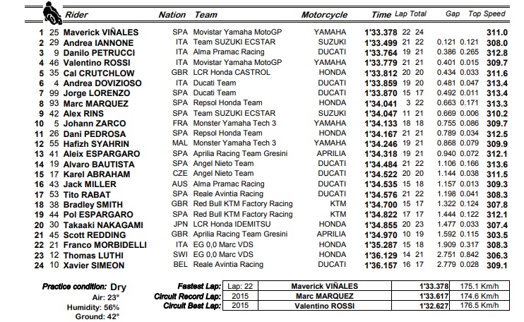 Nesta segunda sessão do dia, Maverick Viñales foi o mais rápido e deixou o segundo classificado Andrea Iannone a 0.121s com uma Suzuki que também mostrou-se competitiva. Danilo Petrucci foi o melhor homem com uma Ducati em mãos ao ser terceiro, tendo ficado na frente de Valentino Rossi, que tem se mostrado muito consistente neste arranque de fim de semana.