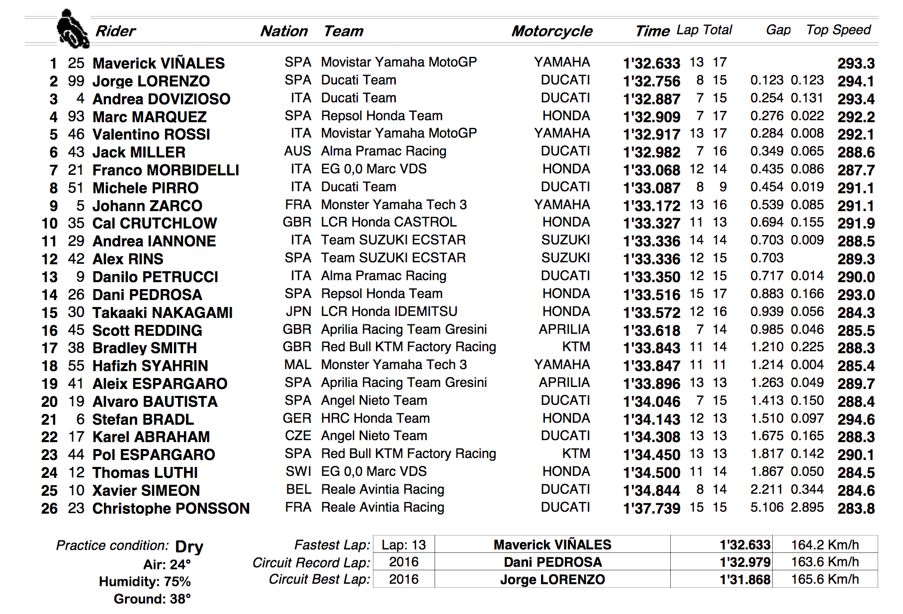 A qualificação promete ser muito animada, com Marc Marquez e Valentino Rossi a terminarem em quarto e quinto, respetivamente, a menos de 0.3s de Viñales.