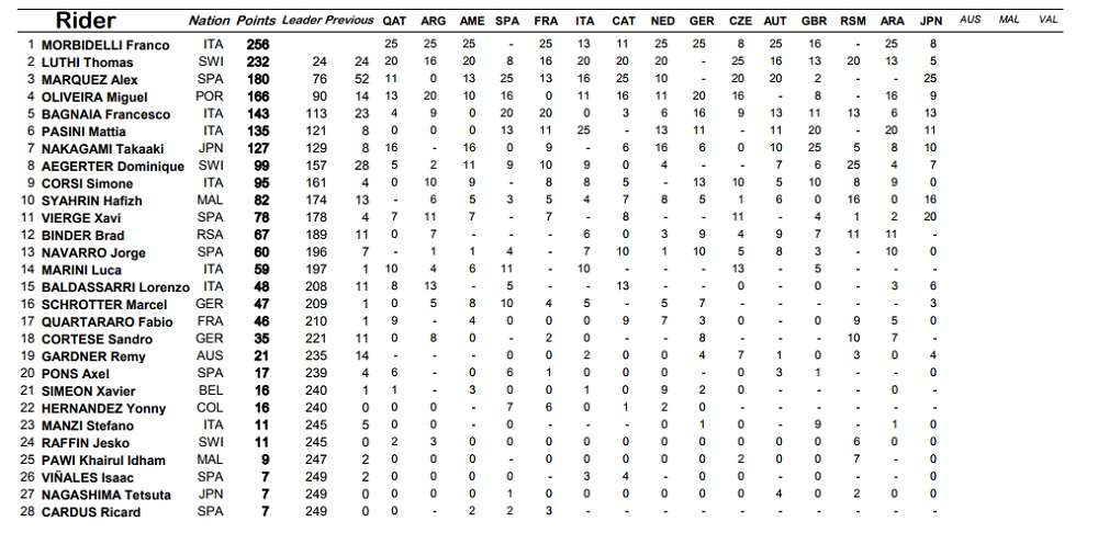 Quanto ao comando do campeonato este continua ainda e sempre nas mãos de Franco Morbidelli. O piloto italo-brasileiro aumentou a sua liderança no campeonato tendo agora 24 pontos de vantagem sobre o segundo classificado, que continua a ser Thomas Lüthi. Porém esta diferença poderá vir a diminuir caso confirme-se a desclassificação de Dominique Aegerter no Grande Prémio de San Marino e da Riviera de Rimini. Aí Lüthi somará mais cinco pontos perfazendo os 25 respeitantes à vitória. Desta forma a diferença entre os dois primeiros do campeonato poderá ficar nos 19 pontos quando estão ainda em jogo 75.