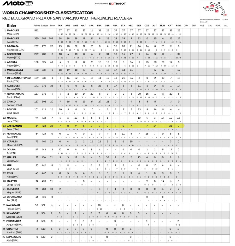 Assim, Enea Bastianini não conseguiu um resultado no seu GP em casa este ano, marcou zero pontos e desiludiu os seus fãs, mantendo o 13º lugar no Campeonato. Lembrar que, em 2024, na altura ainda com a Ducati, venceu este Grande Prémio, após uma espetacular batalha com o campeão do mundo Jorge Martin.