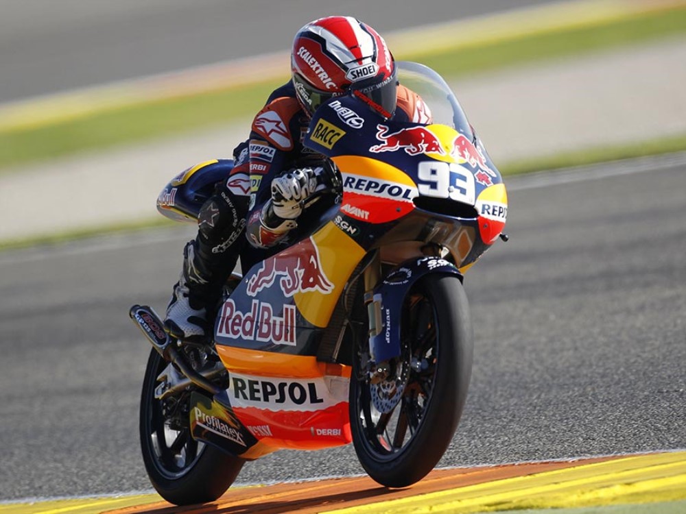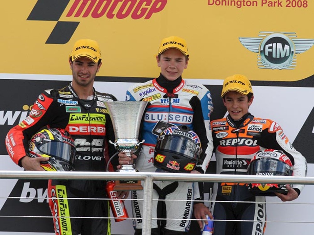 Em 2008, Marc Márquez fazia a sua estreia no Mundial na equipa Repsol KTM 125c, liderada por Alberto Puig e a 22 de junho alcançou o seu primeiro pódio na carreira, terminando o GP da Grã-Bretanha na terceira posição, com Mike Di Meglio e Scott Redding na sua frente