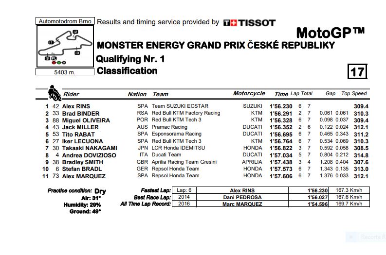 Alex Rins (Suzuki) e Brad Binder (KTM) conseguiram avançar para a segunda sessão decisiva de qualificação em Brno. Stefan Bradl sai de 20º no domingo e Andrea Dovizioso de 18º na grelha de partida