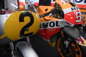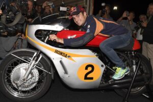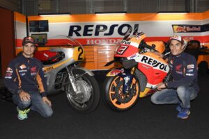Numa sessão fotográfica que contou com os atuais pilotos da equipa da asa dourada Marc Márquez e Dani Pedrosa, os dois pilotos espanhóis foram fotografados com a moto que conquistou o titulo para a Honda à meio século. .