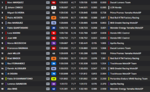 Márquez e Zarco ficaram separados por apenas 0,095 segundos. O terceiro colocado, Miguel Oliveira, perdeu mais de 0,7 segundos para o tempo mais rápido. Pedro Acosta e Alex Márquez completaram os cinco primeiros. Francesco Bagnaia ficou pouco mais de um segundo atrás, em décimo.