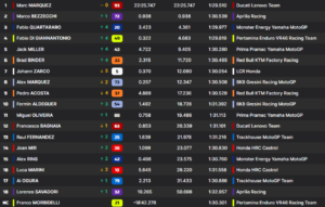 Miguel Oliveira, que chegou a estar instalado no Top 10, antes de ser ultrapassado por Fermin Aldeguer, perdeu a poucas voltas do final o décimo lugar para o italiano da Gresini. O bicampeão de MotoGP, Francesco Bagnaia, perdeu ainda mais terreno para os dois irmãos Márquez ao terminar fora da zona de pontuação em décimo segundo, uma posição abaixo da qual tinha começado.
