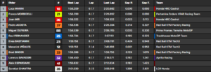 Raul Fernandez caiu para a sexta posição, atrás de Mir, Acosta e Oliveira. Grande frustração na KTM. Viñales teve que estacionar a sua moto devido a um problema, e com Acosta, a melhor RC16 só largou na 14ª posição. A lanterna vermelha foi para o piloto da LCR, Chantra.