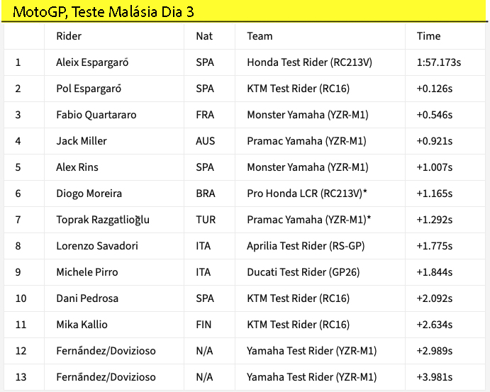 O piloto de testes Lorenzo Savadori também estava focado no shakedown – das motos da Aprilia Racing, antes da chegada de Marco Bezzecchi na terça-feira, e das motos da equipa Trackhouse MotoGP para Raul Fernández e Ai Ogura. Jorge Martín, como sabemos, não participou nos testes na Malásia, mas estará presente com a equipa. A escolha do chassis já foi feita, e é agora na aerodinâmica que Bezzecchi, Fernández e Ogura terão de comparar as opções durante os testes oficiais em Sepang.