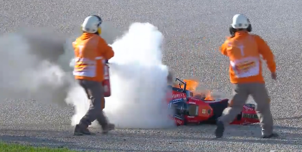 Aparentemente, o piloto de teste da Ducati oficial levou algum tempo a aperceber-se do que se passava, com chamas a sair da parte inferior da sua carenagem, até que acabou por entrar na gravilha, mantendo a calma e praticamente levando a moto a um posto de comissários que, após alguma confusão com os extintores, lá a apagaram….