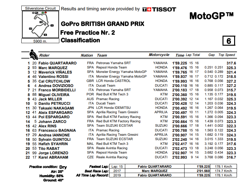 Assim, Fabio Quartararo fez mesmo a volta mais rápida de sempre a Silverstone, 1:59.225, um novo recorde que o coloca no topo da tabela e deixou o rápido Márquez a 0,251 milésimas.