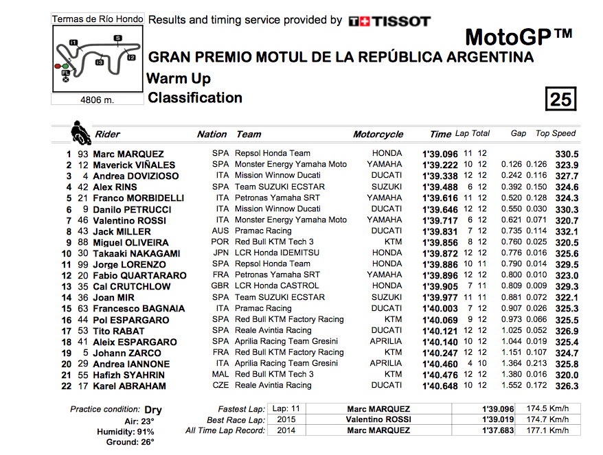 No topo da tabela ficaram precisamente os mesmos pilotos que conseguiram os melhores tempos da qualificação, com Marc Marquez (Honda)no primeiro lugar, seguido de Maverick Viñales (Yamaha) e de Andrea Dovizioso (Ducati).